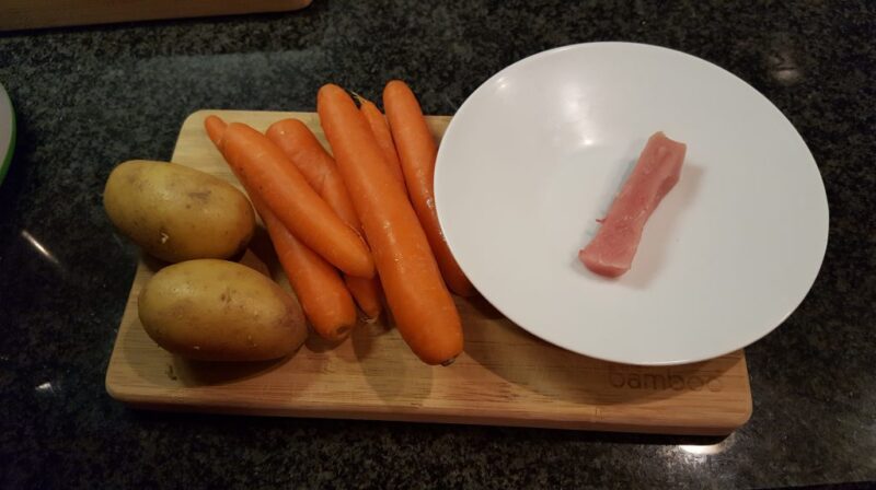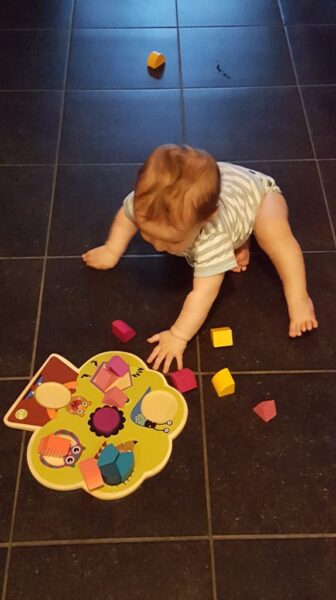 Tegen iets voor tien had er eentje genoeg geslapen. Tijd om te spelen! Van al dat spelen kreeg kapoen T. rond 11u30 honger. Op het menu: een groentenpap van aardappelen, wortelen en varkensvlees. En lekker dat dat was 😉